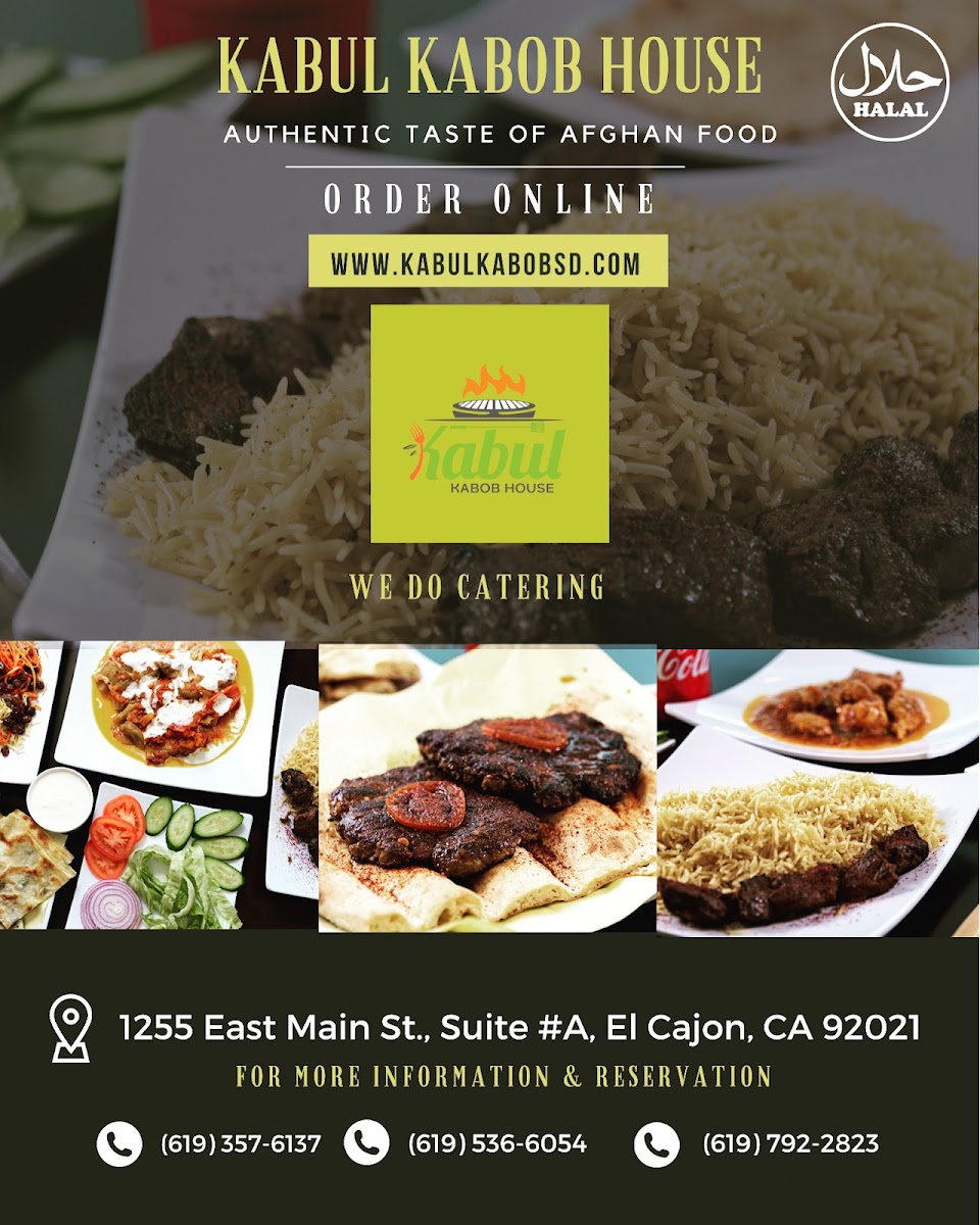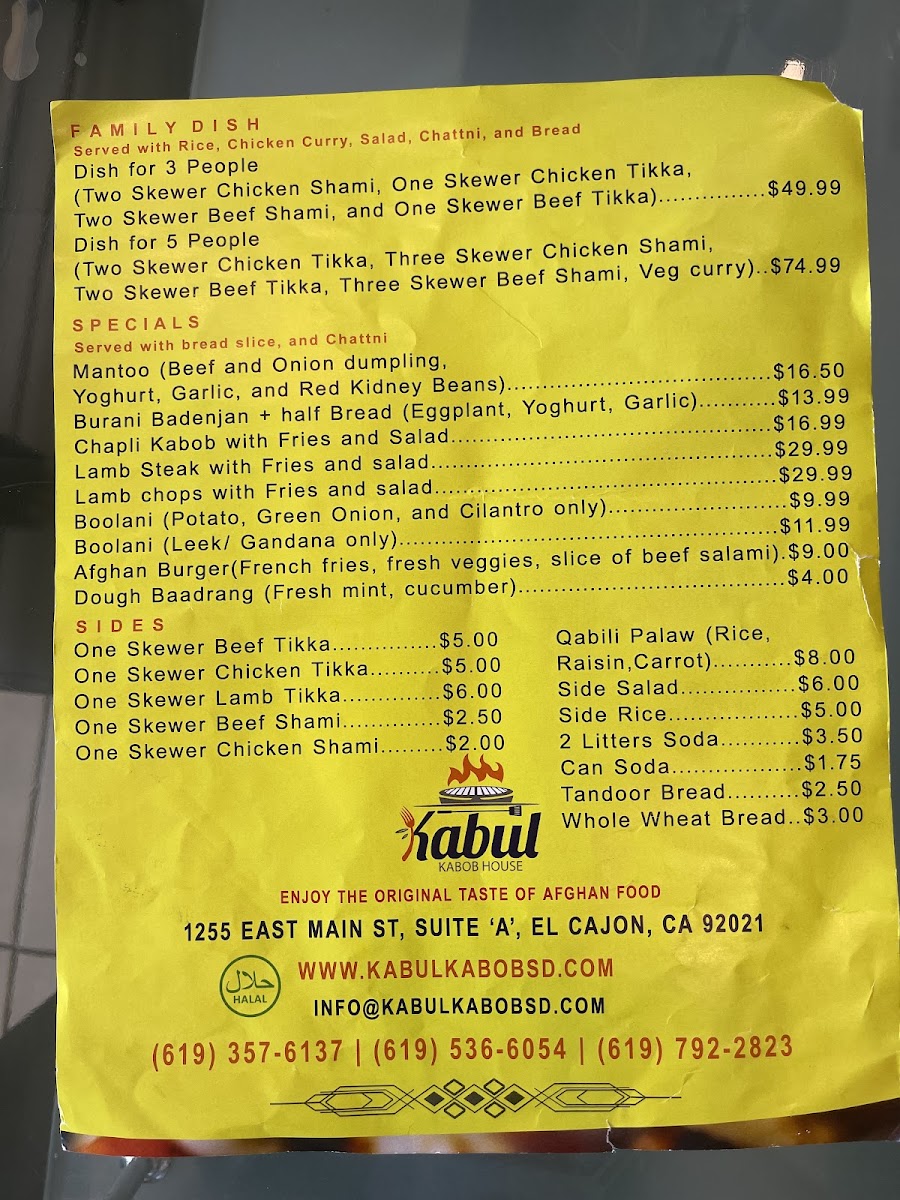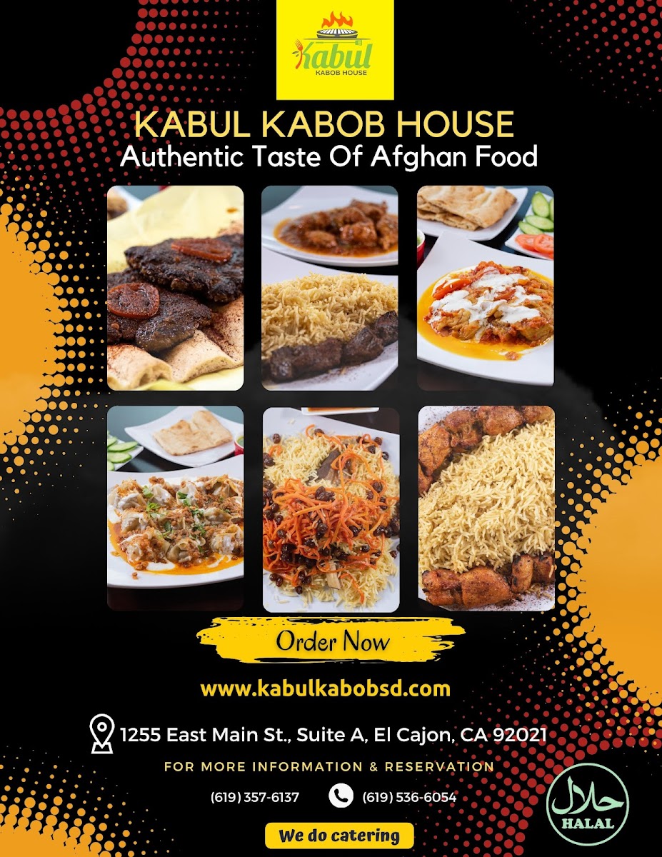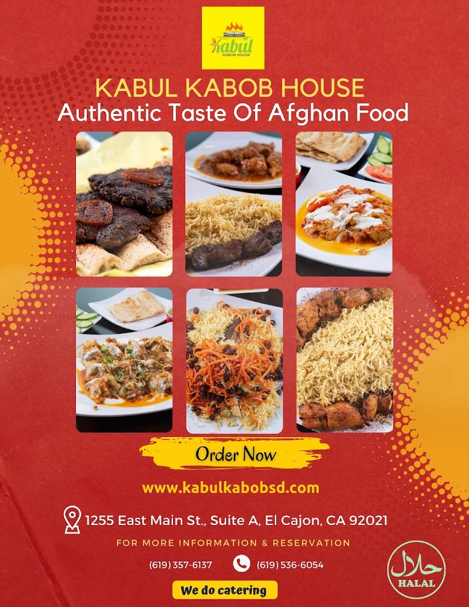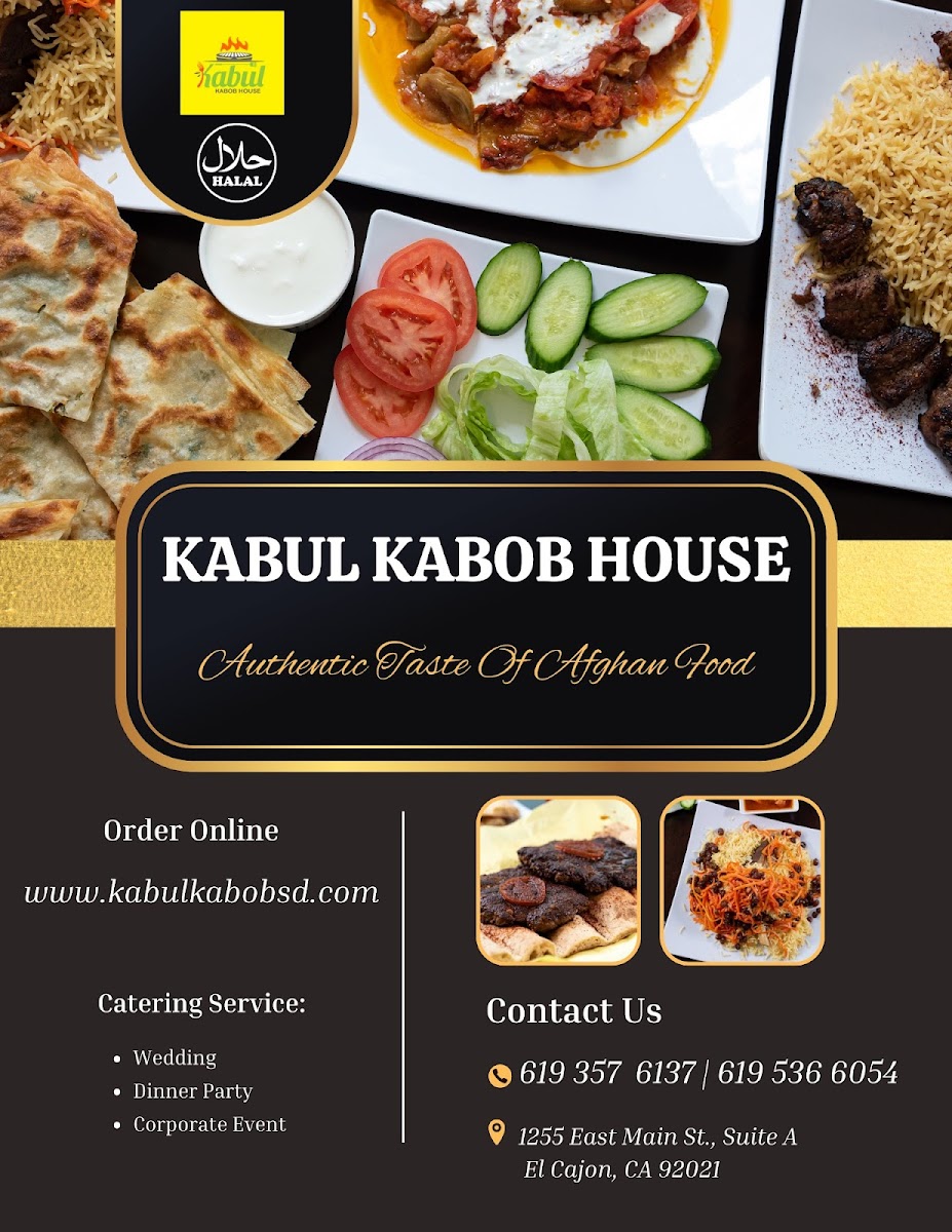 The Kabul Kabob House Menu is a true celebration of flavorful Afghan cuisine. Located at 1255 E Main St Suite A, El Cajon, CA 92021, this cozy spot brings a rich variety of authentic dishes right to your plate. From perfectly seasoned kabobs to tender stews, every bite reflects the heart of Afghan culture. Their menu offers a range of options, whether you're craving grilled meats, freshly baked bread, or vegetarian delights. The kabobs, grilled to perfection, are a standout, served with savory rice and vibrant salads that balance each bite. If you're looking to try something new or enjoy familiar comfort food, Kabul Kabob House has something to satisfy every taste.