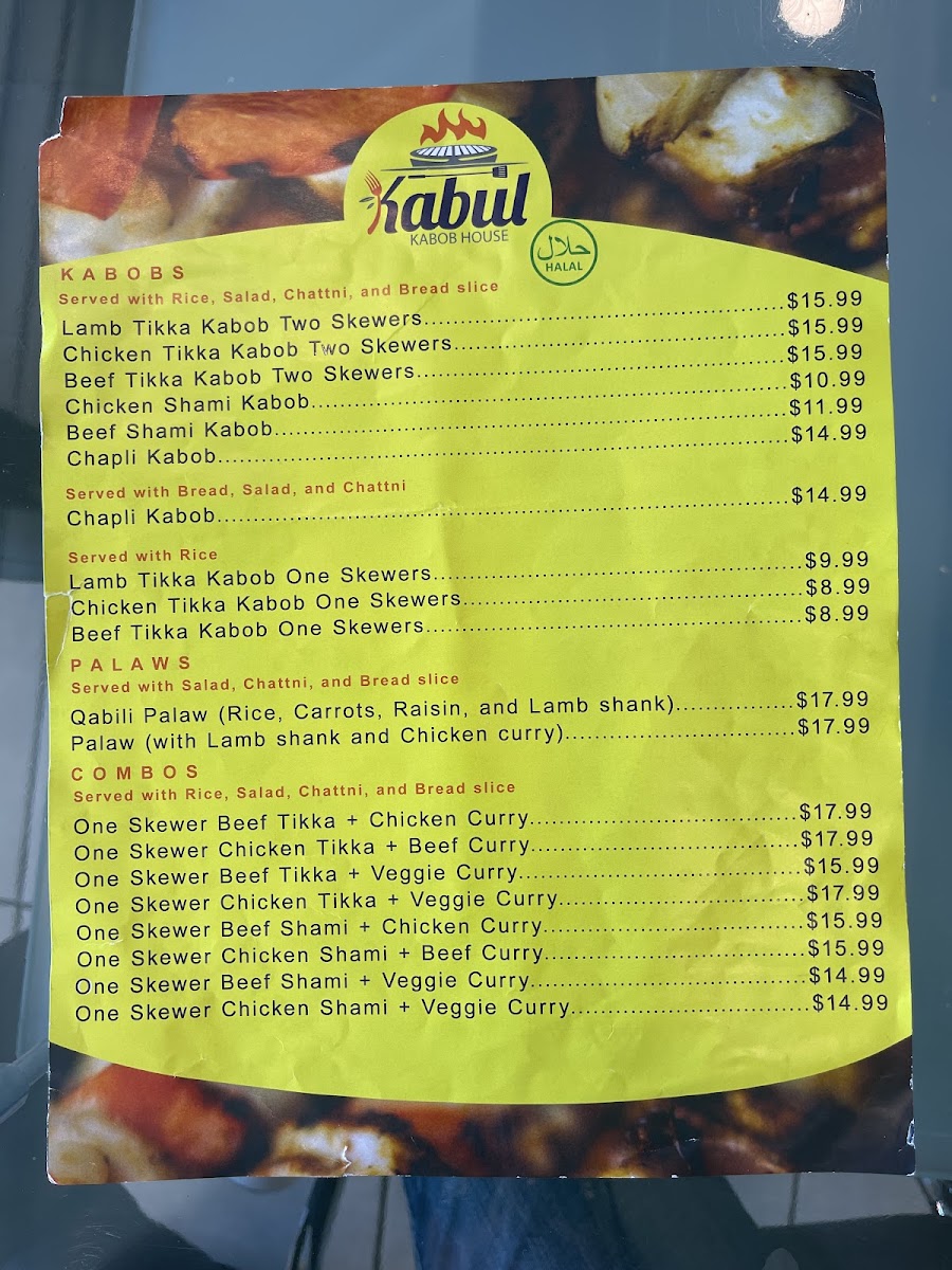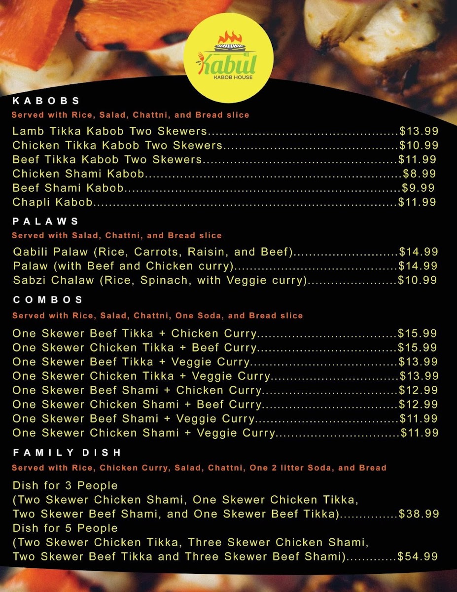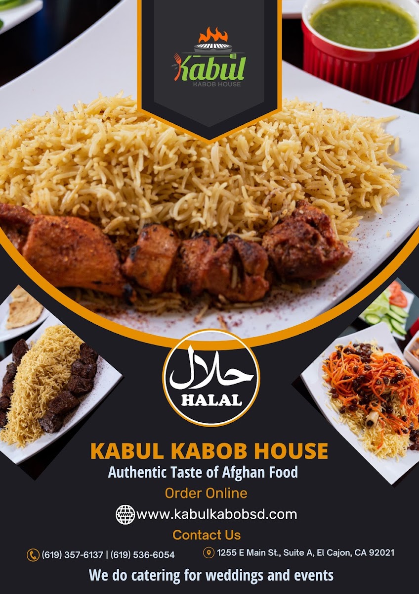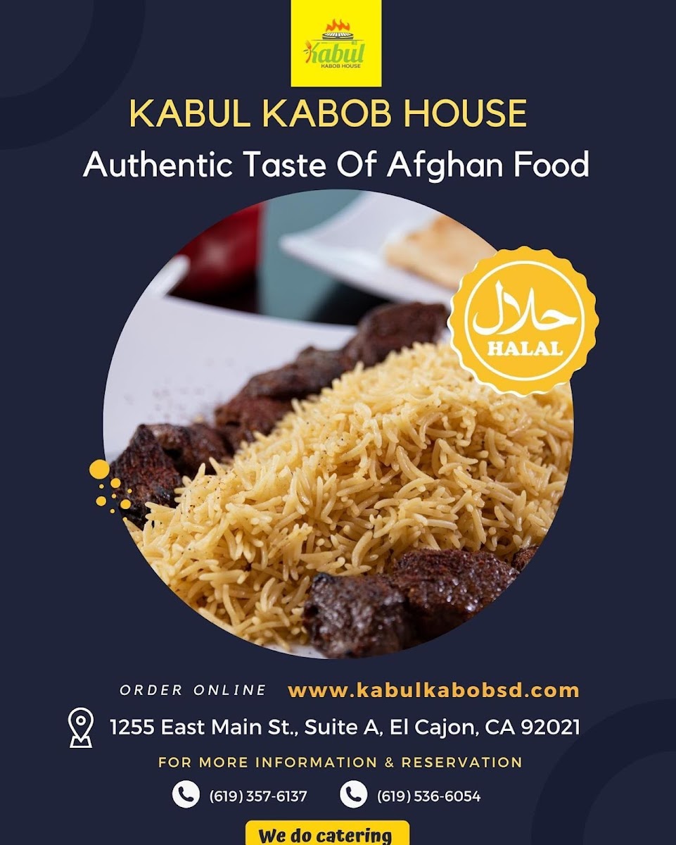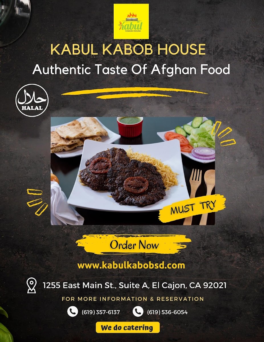 The Kabul Kabob House Menu is a true celebration of flavorful Afghan cuisine. Located at 1255 E Main St Suite A, El Cajon, CA 92021, this cozy spot brings a rich variety of authentic dishes right to your plate. From perfectly seasoned kabobs to tender stews, every bite reflects the heart of Afghan culture. Their menu offers a range of options, whether you're craving grilled meats, freshly baked bread, or vegetarian delights. The kabobs, grilled to perfection, are a standout, served with savory rice and vibrant salads that balance each bite. If you're looking to try something new or enjoy familiar comfort food, Kabul Kabob House has something to satisfy every taste.